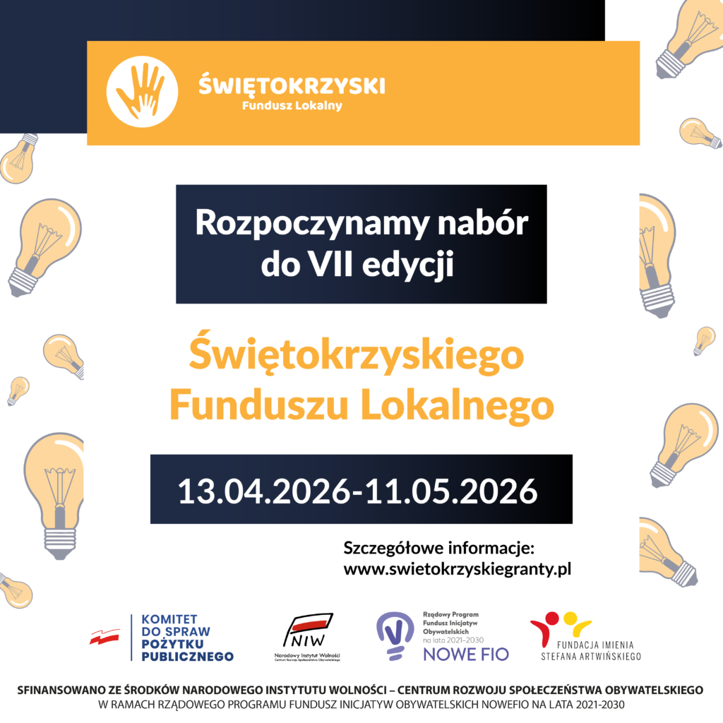 Wnioski można składać od 13 kwietnia do 11 maja 2026 r. Proces aplikowania odbywa się w całości online poprzez generator dostępny na stronie www.swietokrzyskiegranty.pl. Na stronie znajdują się także regulamin konkursu, zasady udziału oraz przykłady projektów dofinansowanych w poprzednich edycjach.Ruszył nabór do VII edycji Programu Świętokrzyski Fundusz Lokalny 2024.